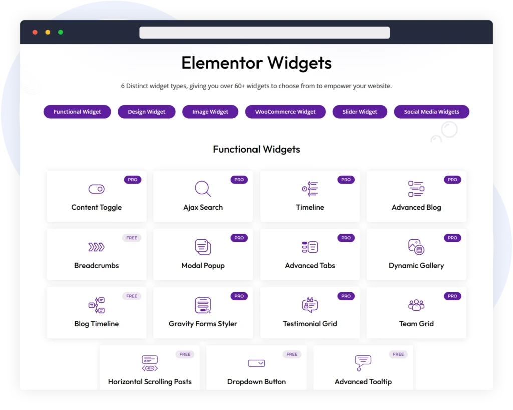 Gain complete control over your Elementor projects with widgets designed for various professional uses. Create exactly what your clients need without writing any code.